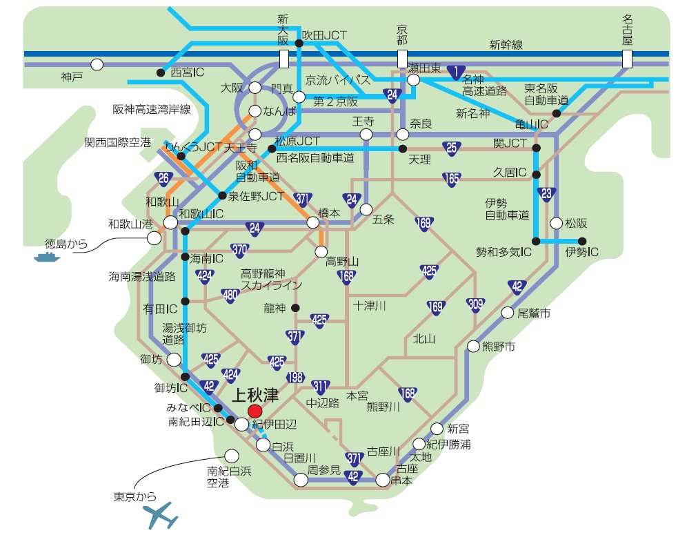 ●紀伊田辺→秋津野ガルテン 龍神バス、タクシーで約10分(1,700円程度)